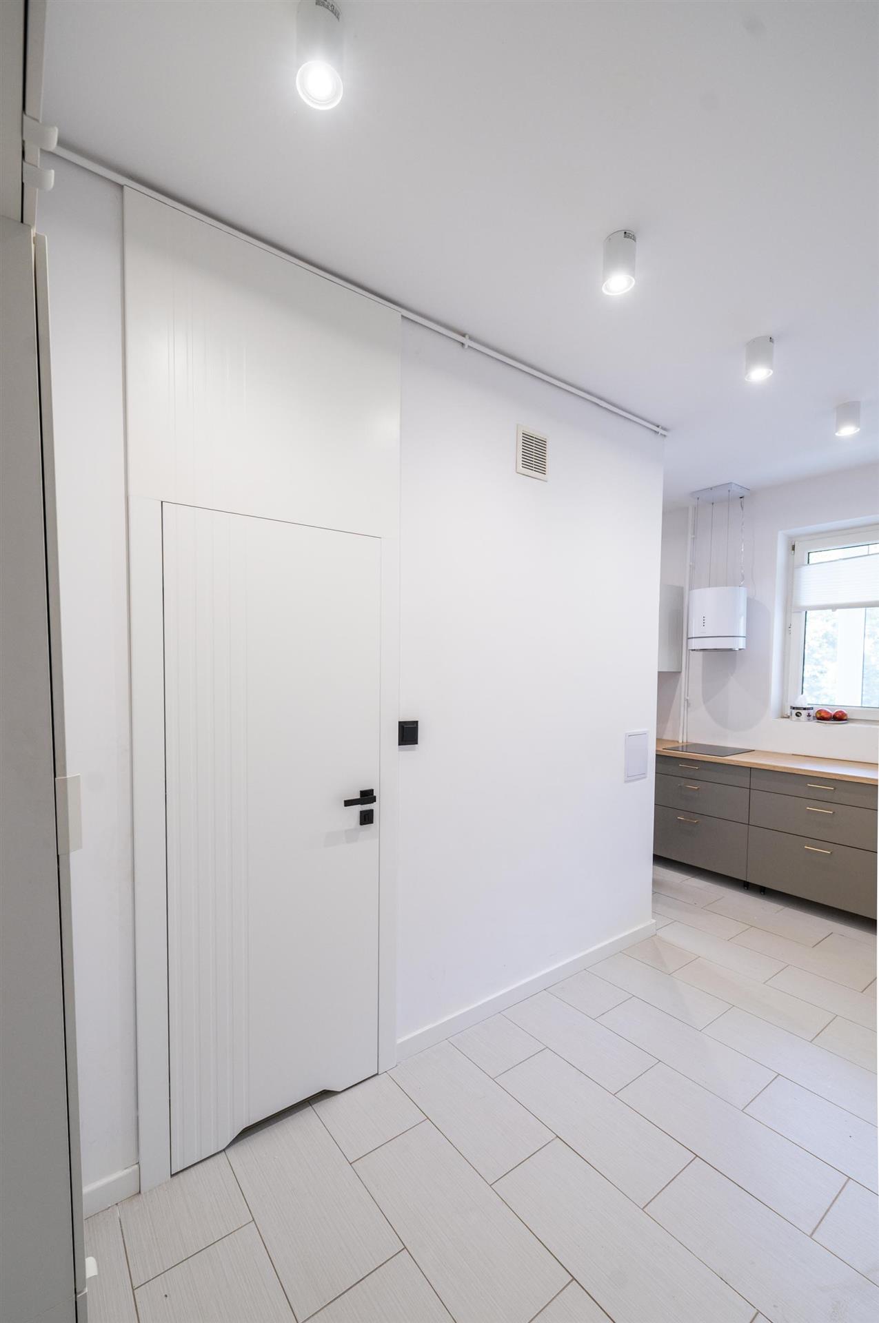Rozkład: salon z przejściem do wydzielonej sypialni, łazienka, kuchnia i przedpokój.